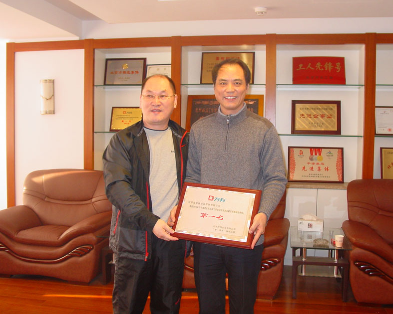 北京萬科領導親赴北京公司授牌 時間:2010-12-14 5213 北京公司在萬科地產第三季度萬科北京區域在建項目產品質量評估中,萬科藍山項目經專家現場實測實量,390個點合格率為99.39%,觀感質量評分、質量風險評估綜合得分97.35%,項目綜合排名蟬聯第一。12月12日上午,北京萬科副總經理孔祥明率工程部經理、項目總經理等一行,特地趕到我公司,把第一名的獎牌隆重授予我公司陳榮春總經理。陳總對萬科的肯定和信任表示感謝,并期望雙方進一步加強友好合作,永續真誠友誼。