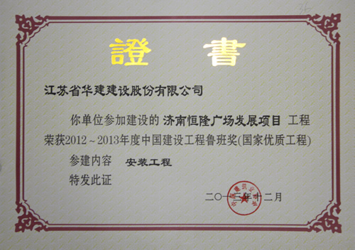 濟南恒隆廣場喜獲“2012-2013年度中國建設工程魯班獎(國家優質工程)” 時間:2013-12-09 5310 12月5日,2012-2013年度中國建設工程魯班獎表彰大會在北京友誼賓館舉行,中國建筑業協會對2012-2013年度國內優秀建筑工程進行了隆重表彰,上海公司參建的濟南恒隆廣場喜獲全國建設工程最高榮譽——“魯班獎”,這是我公司第一次獲此殊榮。江蘇華建副總經理、上海公司總經理楊杰出席了頒獎大會。