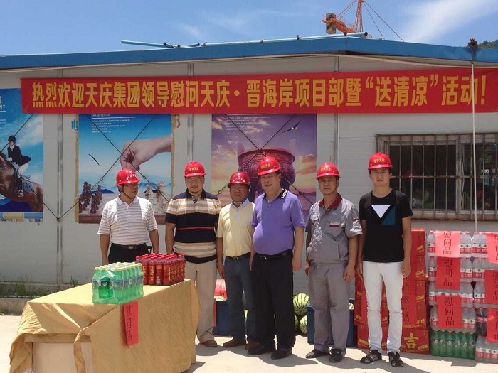 千里送清涼——天慶集團董事長韓慶慰問我司一線職工 時間:2015-08-05 4302 8月4日中午,烈日當空,驕陽似火。甘肅天慶房地產集團有限公司董事長韓慶一行不遠千里來到廣東珠海,頂著烈日,冒著酷暑,在項目負責人陳建的陪同下,慰問我司承建的“天慶·晉海岸”項目一線施工人員,給工人們送來了西瓜、礦泉水、王老吉等飲品和深情問候,讓廣大一線職工在炎炎烈日下感受到陣陣清涼。