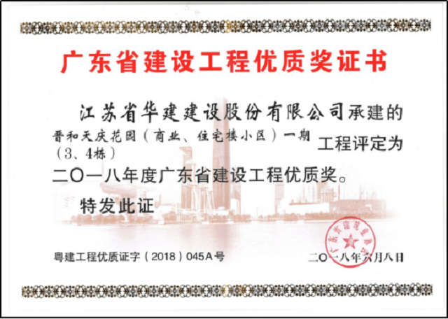 近日,根據廣東省建筑業協會粵建協[2018]49號文件《關于公布2018年度廣東省建設工程優質獎名單的通知》,由珠海公司承建的晉和天慶花園一期工程喜獲廣東省建設工程優質獎。