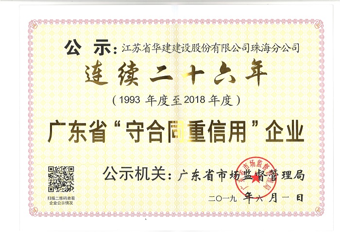 近日,珠海公司被廣東省市場(chǎng)監(jiān)督管理局(原公示機(jī)關(guān)為廣東省工商行政管理局授予連續(xù)二十年守合同重信用企業(yè)榮譽(yù)稱(chēng)號(hào)。