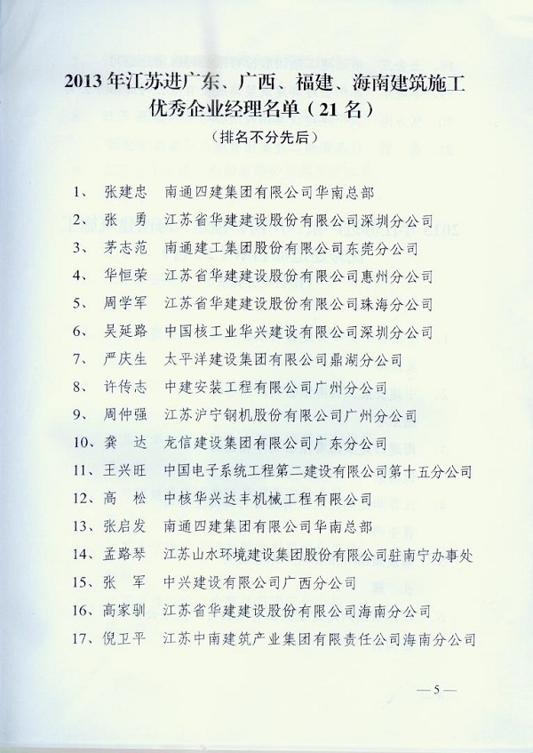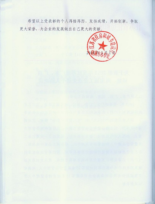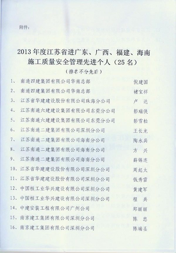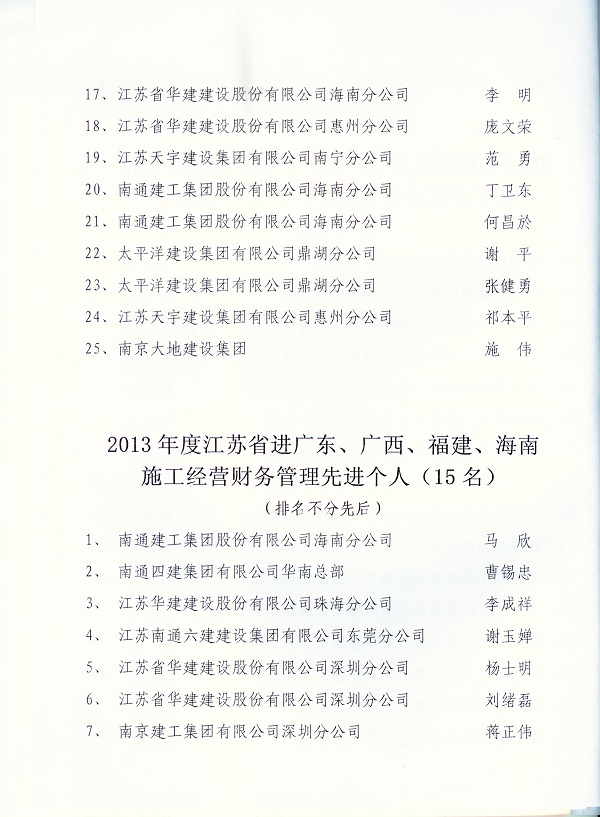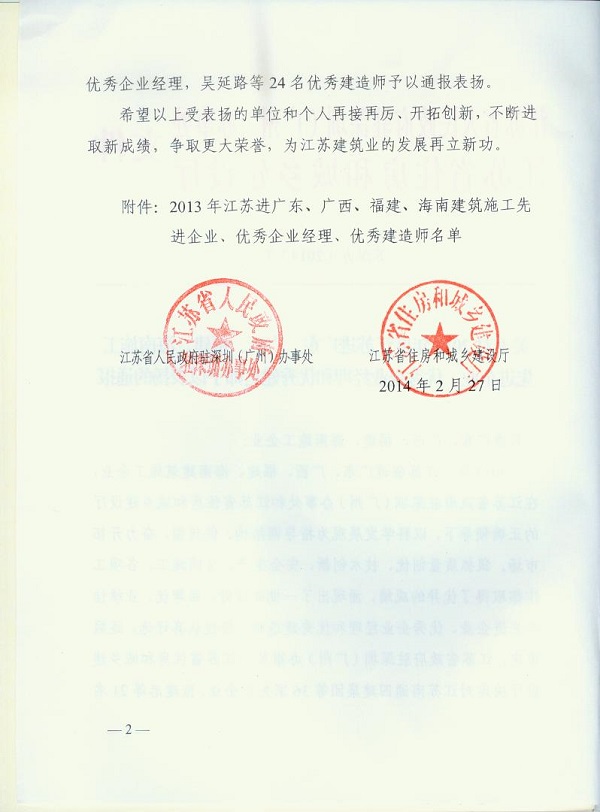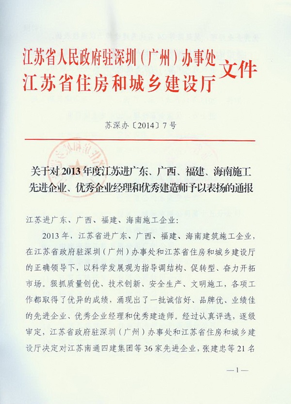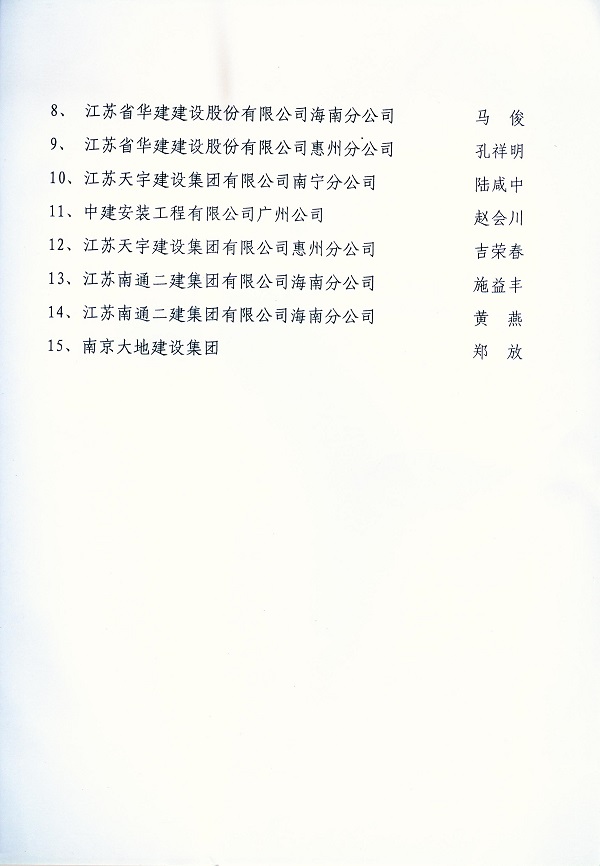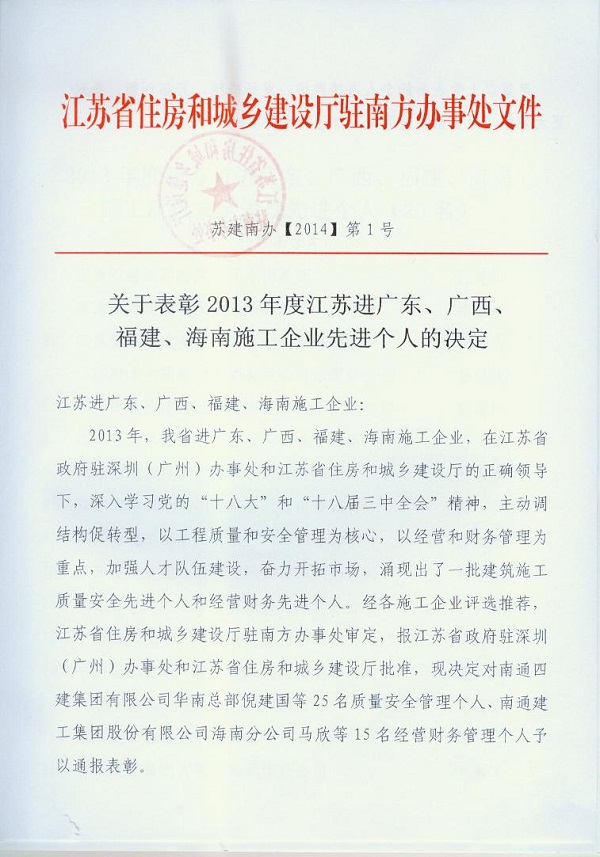 2013年江蘇進(jìn)粵、桂、閩、瓊建筑施工先進(jìn)企業(yè)、優(yōu)秀企業(yè)經(jīng)理、優(yōu)秀建造師及經(jīng)營(yíng)財(cái)務(wù)管理、質(zhì)量安全管理先進(jìn)個(gè)人 時(shí)間:2014-04-29 3993 0