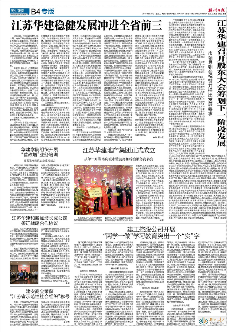 今天出版的《揚州日報》B4“揚州建工”專版刊登了江蘇華建穩健發展沖進全省前三、華建股東大會...
