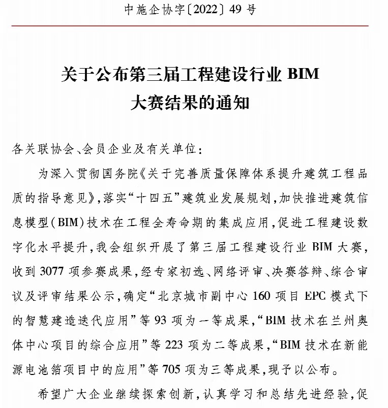 日前,中國施工企業管理協會公布了第三屆工程建設行業BIM大賽結果,“中海望京府項目施工階段 BIM 綜合應用”從全國3077項申報成果脫穎而出,獲大賽三等獎。據悉,此次大賽申報項目多為規模較大公建項目的BIM應用成果,包頭中海望京府作為住宅小區項目能夠以排名602位獲得國家級BIM大賽獎項來之不易。