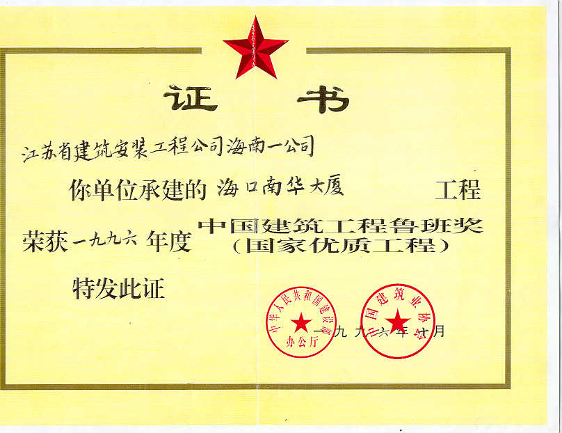 ??谑心先A大廈工程于1994年5月竣工,1995年6月被評為海南省優質樣板工程,1995年12月被評為建設部優質樣板工程,1996年10月榮獲建筑工程魯班獎。