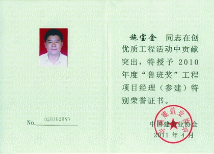 施寶金 時間:2012-04-10 7780 施寶金,高級工程師,現任深圳公司七處二工區常務副主任、項目經理。1996年到深圳參加工作,參與過國際商會中心、榮超經貿中心、江勝大廈、綠景紀元大廈等重點項目施工,獲“深圳市建筑業企業優秀項目經理”稱號,被授予“創魯班獎工程項目經理特別榮譽證書”。