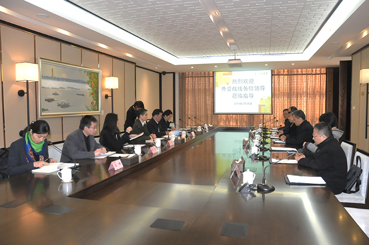 2月25日上午,國家外交部外事管理司廖力強司長、中央外辦外管局宋軍處長等一行5人,在省外辦副主任張松平、揚州市副市長汪志堅、市外辦副主任徐靜等陪同下,到江蘇華建開展外事工作服務企業發展專題調研,公司領導陸金龍、陳榮春、程杰、陸俊等一同接待。