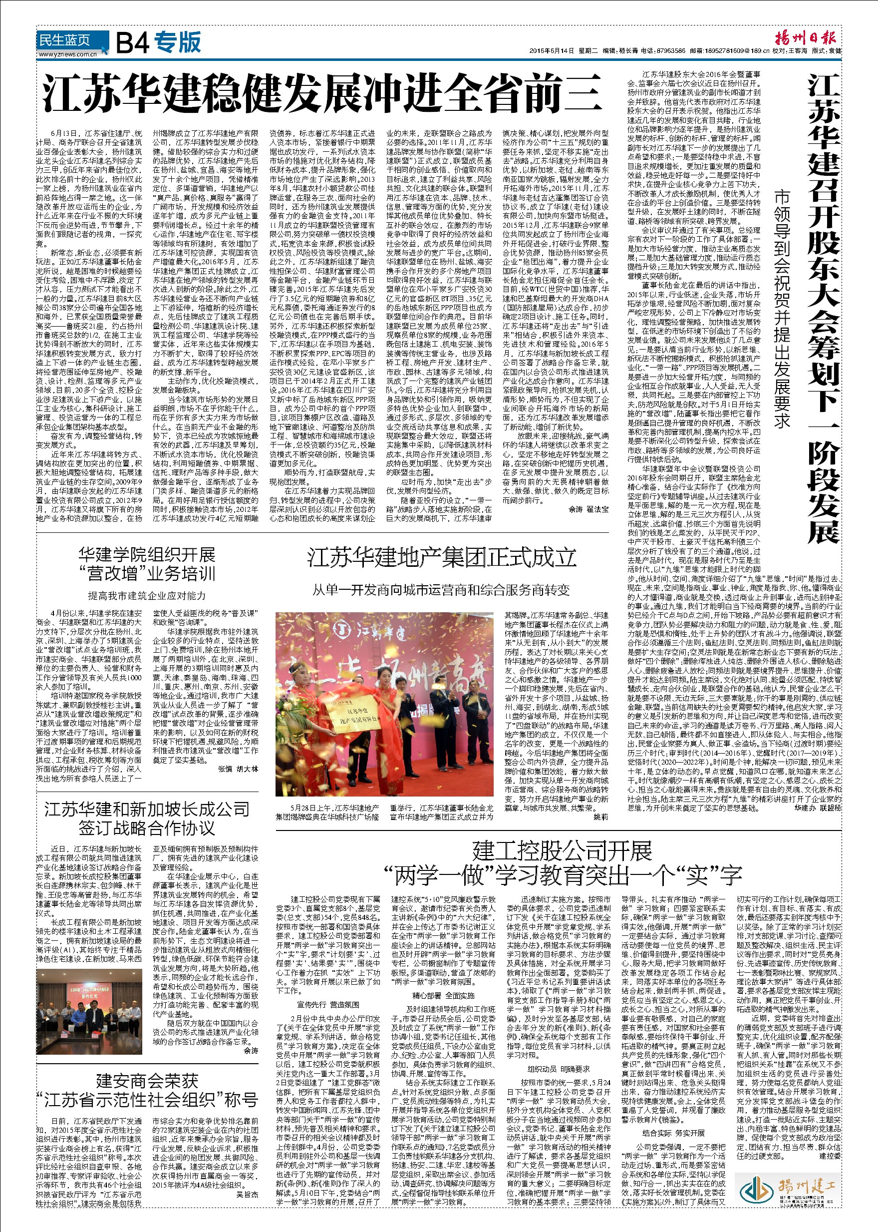 今日《揚州日報》刊登專版文章報道華建進入全省前三有關消息 時間:2016-06-14 4462 今天出版的《揚州日報》B4“揚州建工”專版刊登了江蘇華建穩健發展沖進全省前三、華建股東大會、華建地產集團成立、“兩學一做”學習教育等相關文章,歡迎關注。