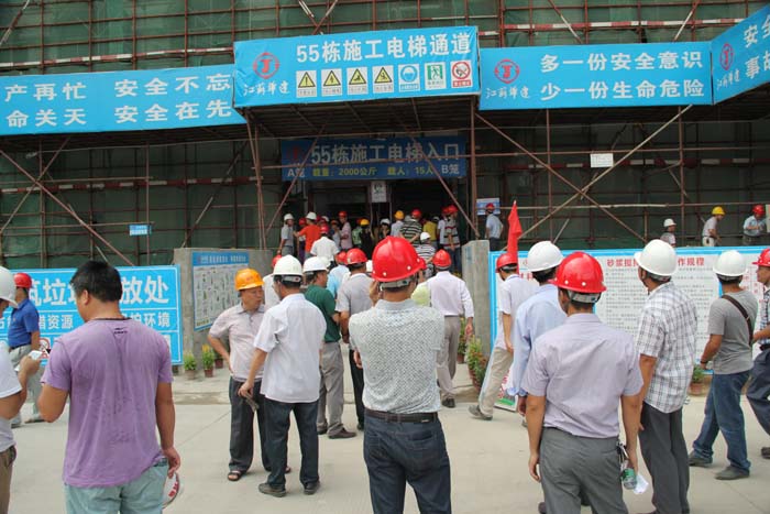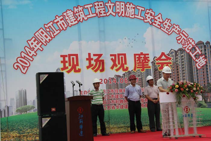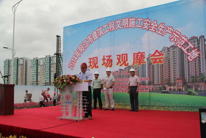 617日上午,“2014年陽江市建筑工程文明施工安全生產示范工地現場觀摩會”,在我公司第一項目部施工的陽光馬德里二期工程項目現場舉行。陽江市建設局副局長馮成富、質量安全監督站站長林子歡、書記何聲海和各縣(市、區)住建局安全生產分管負責人、安監站站長以及所有施工、監理單位負責人、安全管理人員近300人參加觀摩會。